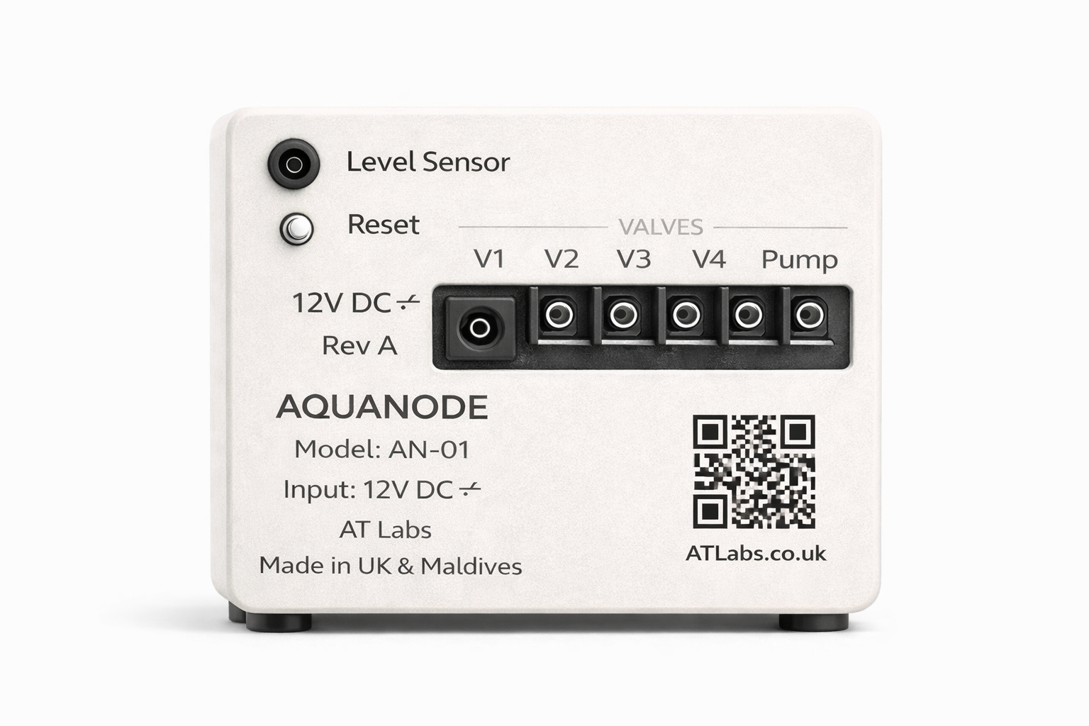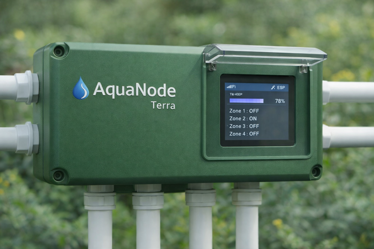AquaNode Terra is an intelligent outdoor watering controller built for precise, automated irrigation. Powered by ESP32 hardware, it can manage up to four separate watering zones through four solenoid valves. It can connect to up to ten AquaSense Terra soil sensor modules, which communicate wirelessly over ESP-NOW to provide live environmental data. The main unit includes an LCD screen showing key information such as soil temperature and the battery level of each connected sensor.