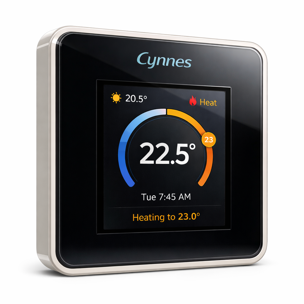 Cynnes is a modern, minimal thermostat with a glass-like front and a responsive touch-led interface designed for daily use. The focus is on clean aesthetics, intuitive control, and dependable heating integration.