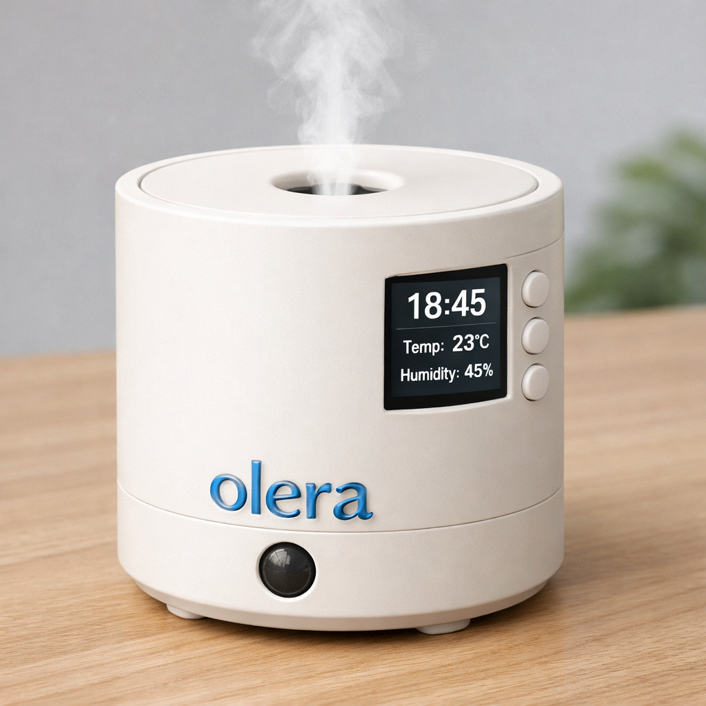 Olera is a compact fragrance diffuser and humidifier designed for effortless day-to-day use. With an integrated PIR sensor, it can respond automatically to movement, making it ideal for spaces such as bathrooms, hallways, treatment rooms, or personal relaxation areas. A built-in LCD displays live temperature and humidity, while onboard controls allow timer-based operation, PIR-triggered activation, and flexible smart behaviour settings.