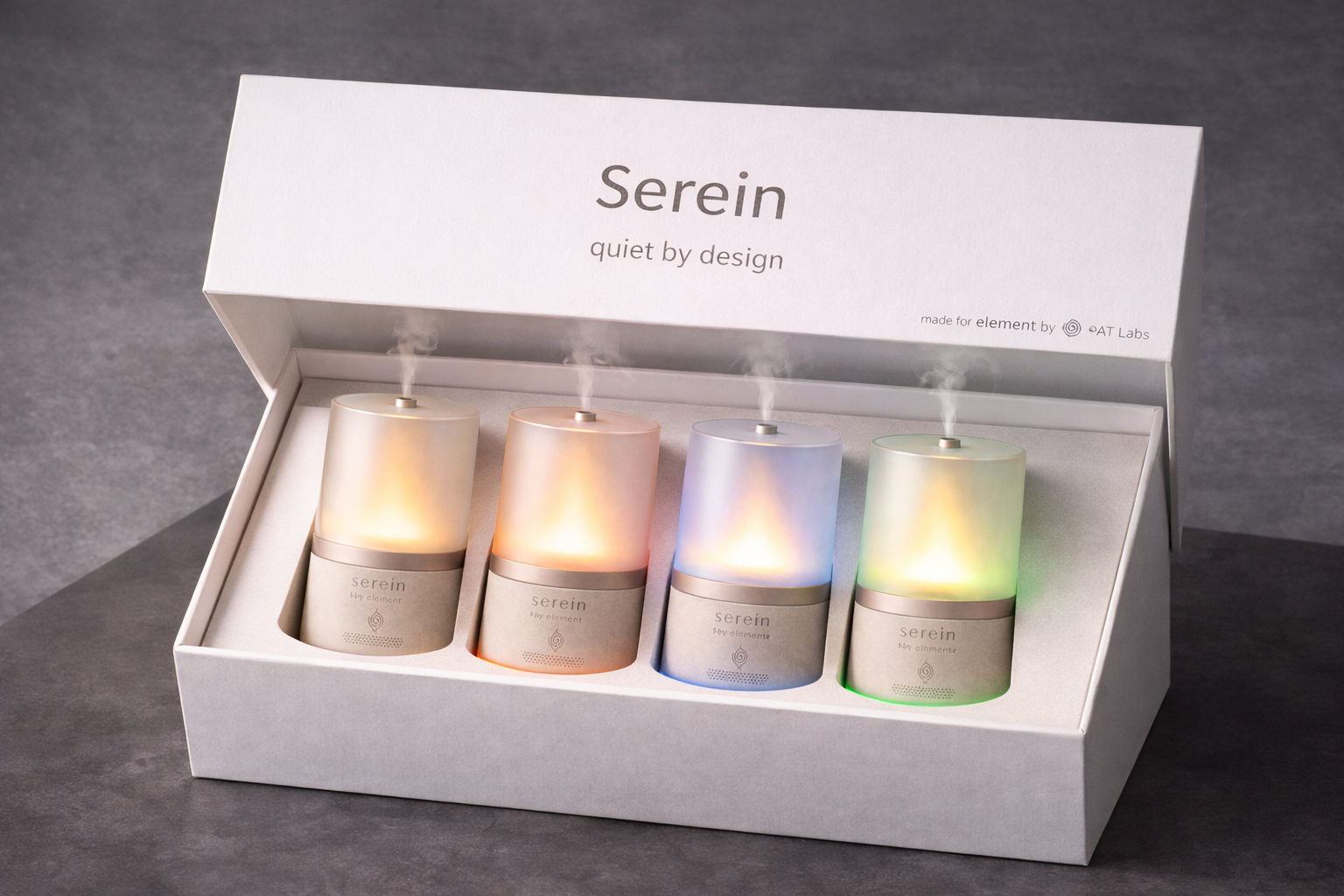 Serein is a calming scent diffuser designed to elevate quiet moments — from immersive sound baths to everyday personal use. A fine aromatic plume is generated by a piezoelectric plate for clean, consistent diffusion, while a built-in LED creates a soft, natural candlelight effect. A compact speaker adds gentle nature soundscapes, and Bluetooth connectivity allows easy control of ambience and audio.